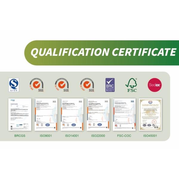 Certification : ISO 9001, ISO 14001, ISO 22000, FSC, SEDEX, BRC
